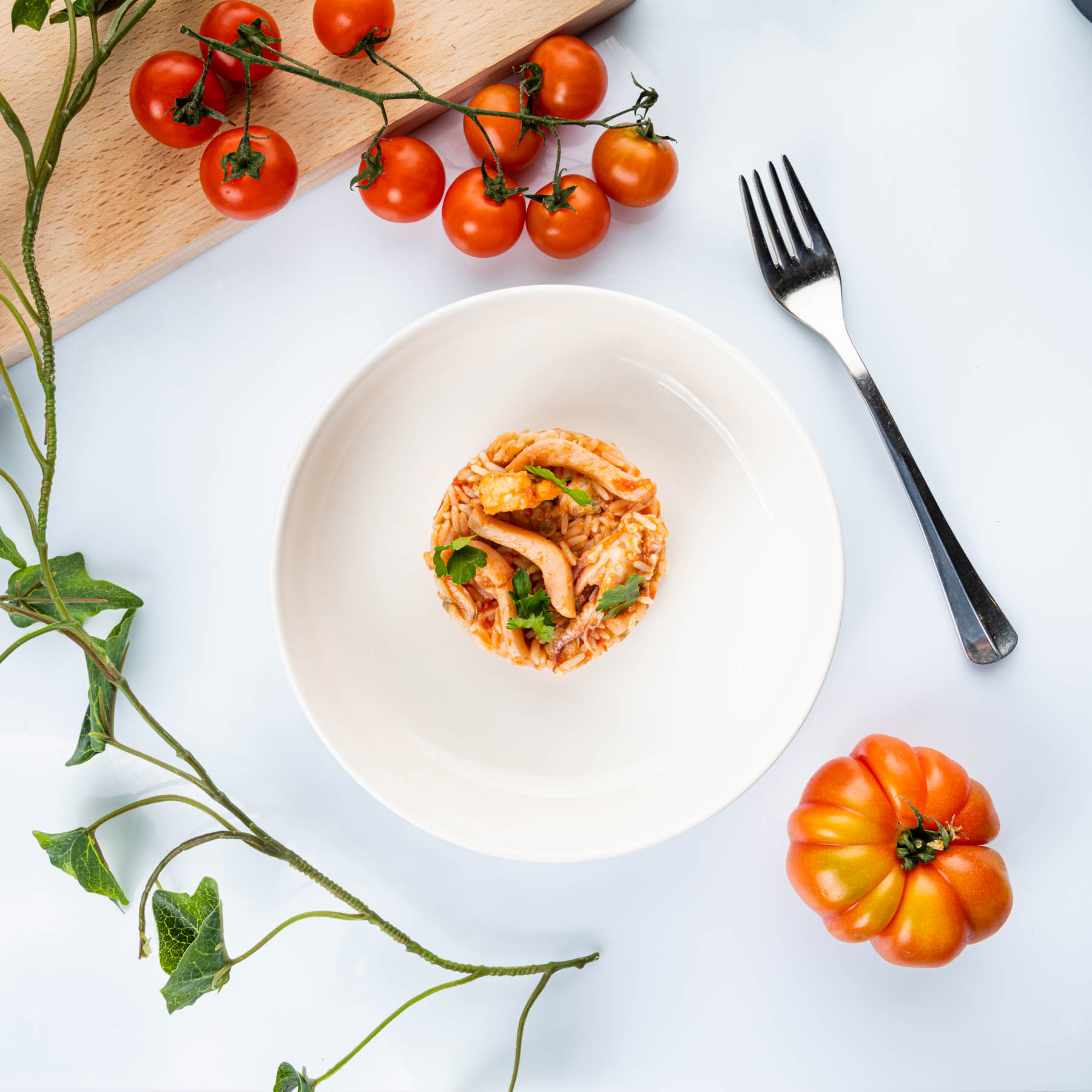 Riso (65%), pomodoro, CALAMARO, MAZZANCOLLA (contiene antiossidanti E223 SOLFITI), VONGOLA INDOPACIFICA, olio extravergine di olive, cipolla fresca, pasta di ACCIUGHE, colatura di PESCE.